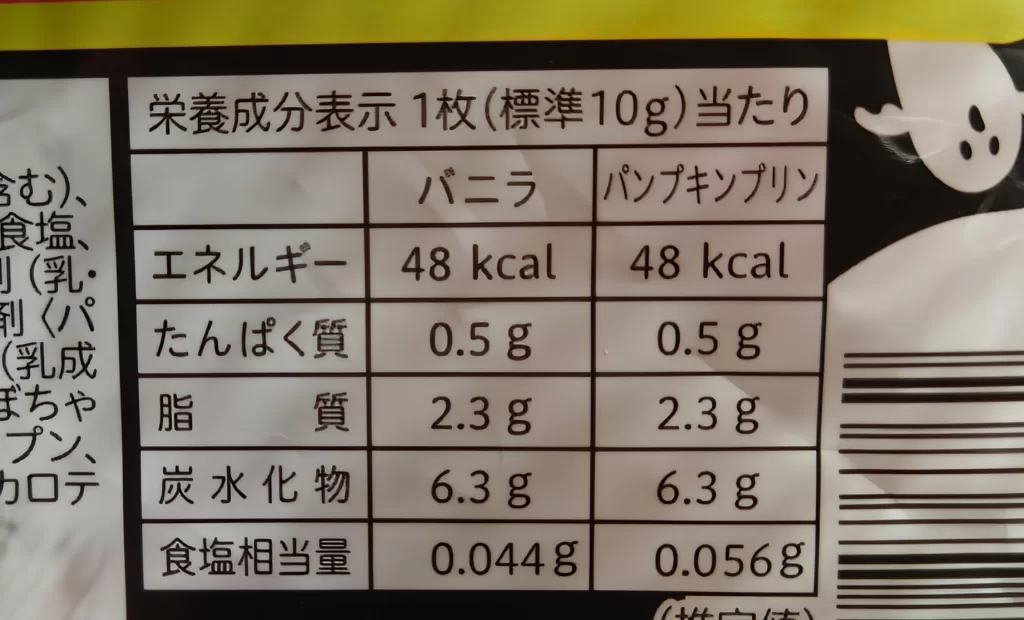 どちらのフレーバーも1枚当たり標準10gで、バニラ味とパンプキンプリン味ともに1枚48kcalです。
