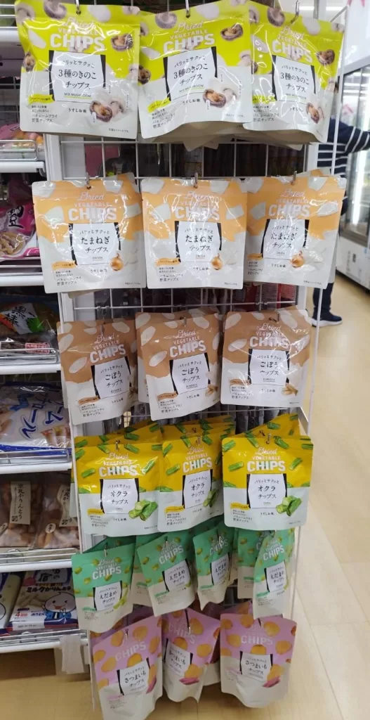 今回購入したダイソーの野菜チップスは、おやつコーナーにありました。