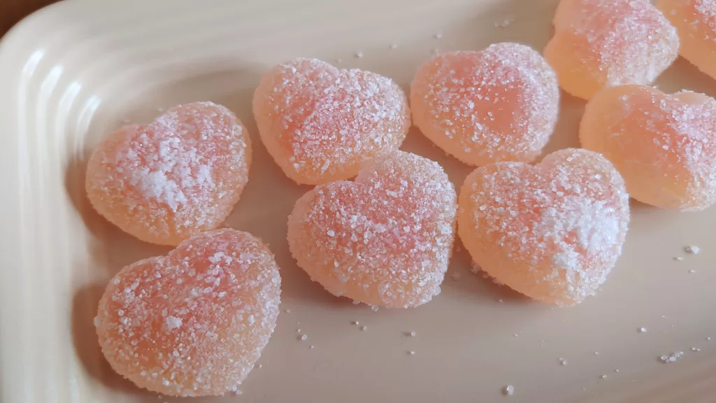 カンロ「ピュレグミプレミアム 山梨産白桃」は、ぷっくりとしたハート型のグミで、封を開けた瞬間から甘い桃のいい香りがします。